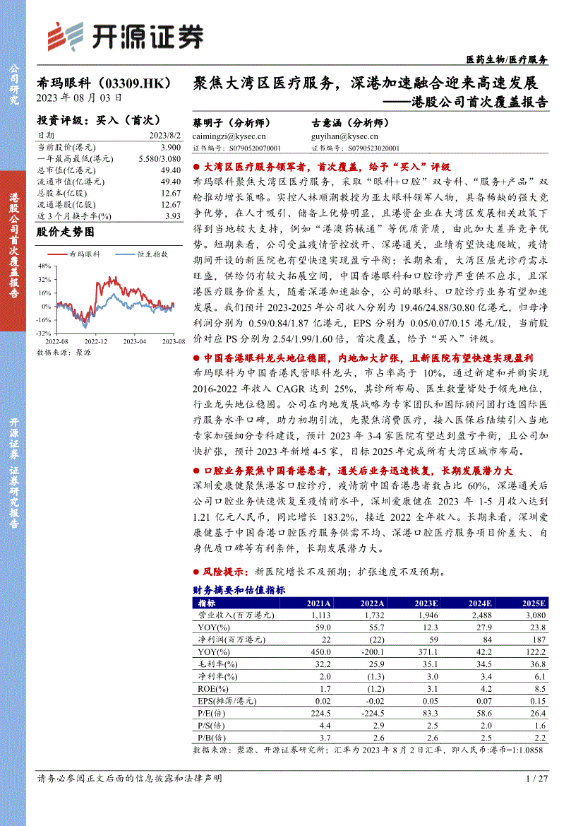 医药生物/医疗办事希玛眼科( 2023年08月03日投资评级:买入(初次) 日期2023/8/2 当前股价(港元) 3.900 一年最高最低(港元) 5.580/3.080 总市值(亿港元) 49.40 畅通市值(亿港元) 49.40 总股本(亿股) 12.67 畅通港股(亿股) 12.67 近3个月换手率(%) 3.93 股价走势图数据来历:聚源聚焦大湾区医疗办事,深港加快融合送来高速成长——港股公司初次笼盖演讲蔡明子(阐发师)古意涵(阐发师) 证书编号:S01 证书编号:S01 大湾区医疗办事领军者,初次笼盖,赐与“买入”评级希玛眼科聚焦大湾区医疗办事,采纳“眼科+口腔”双专科、“办事+产物”双轮鞭策增加策略。实控人林顺潮传授为亚太眼科领甲士物,具备稀缺的强大合作劣势,正在人才吸引、储蓄上劣势较着,且港资企业正在大湾区成长相关政策下获得本地较大支撑,例如“港澳药械通”等优良天分,由此加大差别合作劣势。短期来看,公司受益疫情管控铺开、深港通关,业绩无望快速爬坡,疫情期间开设的新病院也无望快速实现盈亏均衡;持久来看,大湾区屈光诊疗需求兴旺,供给仍有较大拓展空间,中国眼科和口腔诊疗严沉求过于供,且深港医疗办事价差大,跟着深港加快融合,公司的眼科、口腔诊疗营业无望加快成长。中国眼科龙头地位安定,内地加大扩张,且新病院无望快速实现盈利希玛眼科为中国平易近营眼科龙头,市占率高于10%,通过新建和并购实现2016-2022年收入CAGR达到25%,其诊所结构、大夫数量皆处于领先地位,行业龙头地位安定。公司正在内地成长计谋为专家团队和国际参谋团打制国际医疗办事程度口碑,帮力初期引流,先聚焦消费医疗,接入医保后连续引入本地专家加强细分专科扶植,估计2023年3-4家病院无望达到盈亏均衡,且公司加速扩张,估计2023年新增4-5家,方针2025年完成所有大湾区城市结构。口腔营业聚焦中国患者,通关后营业敏捷恢复,持久成长潜力大深圳爱健康聚焦港客口腔诊疗,疫情前中国患者数占比60%,深港通关后公司口腔营业快速恢复至疫情出息度,深圳爱健康正在2023年1-5月收入达到1.21亿元人平易近币,同比增加183.2%,接近2022全年收入。持久来看,深圳爱健康基于中国口腔医疗办事供需不均、深口岸腔医疗办事项目价差大、本身优良口碑等有益前提,持久成长潜力大。2013年公司进入中国内地,正在深圳福田开业首家眼科病院,考虑到内地医保政策下营业开展模式和中国有所分歧,2014-2017年公司专注成长福田希玛,摸索内地复制经验,福田希玛正在开业1年即实现盈利,后续连结快速成长。公司于2018年内地扩张,开设希玛和深圳宝安希玛,2019年正在昆明和上海收购2家病院,2020-2022年疫情期间开设珠海、惠州、福州、广州、揭阳病院,因为疫情影响营业开展,以上新病院盈亏均衡期拉长,但已试探出成熟的运营经验,正在2023年疫情管控铺开后业绩无望快速提拔,公司方针2023年3-4家病院实现盈亏均衡。正在营业拓展方面,公司正在2022年收购深圳爱健康开展口腔诊疗营业,深圳爱健康正在深圳深耕多年,已堆集优良口碑,短期内受益于通关诊疗人数敏捷添加,持久来看因为中国口腔医疗办事供需不均、深口岸腔医疗办事项目价差大,深圳爱健康成长空间大、增加确定性强。除了医疗办事营业,公司也正在2023年通过收购Apollo Lens进军上逛产物市场,由此开展双专科·双轮鞭策增加策略。图1:公司正在中国和内地持续扩大营业结构,收入规模也持续提拔材料来历:公司官网、开源证券研究所2、实控报酬亚太眼科界领甲士物,构成稀缺强大合作劣势2.1、实控人股权集中,2022岁尾引入计谋投资者公司实控报酬林顺潮先生,林顺潮先生、李肖婷密斯(配头关系)为分歧步履人,别离持有希玛集团无限公司70%、30%股份,林顺潮先生和李肖婷密斯间接和间接持有上市公司54.4%股份,公司实控人持股不变。2022年12月公司通过新股配售引入中国出名投资人和企业家龚虹嘉先生做为计谋投资者,龚先生完成买卖后通过银杏基金持有公司约2.37%股份。龚虹嘉先生正在2022年福布斯中国富豪榜排名第29位,正在中国大健康和电讯范畴投资经验丰硕,其入股希玛眼科展现出其对希玛眼科后续成长前景的决心。港股公司初次笼盖演讲图2:实控人股权集中材料来历:公司年报、开源证券研究所林顺潮先生为亚太眼科界领甲士物,构成稀缺强大合作劣势:林顺潮先生1984年结业于大学医学专业,成为注册执业大夫,1998年出任中文大学眼科及视觉科学系从任,用10年时间把中文大学眼科打形成国际名列前茅的眼科核心之一。林传授正在眼科的科研丰盛,曾颁发逾800篇SCI文章,创下多个世界第一科研,正在2012年开办《亚太眼科医学》(APJO)并担任创刊总编纂,2021年APJO成为SCI一份子,并正在2023年的《期刊演讲》中初次进入全球眼科期刊十大,最新排名为亚洲第一、亚太第一、全球第七。林传授正在亚太眼科具有强大影响力,是APAO(亚太眼科学会)成立57年来首位中国人会长(2015年),持续6年荣获世界最有影响力眼科人物100强,正在2023年2月举办的亚太最具影响力眼科大夫100强中排名第一。基于林传授的影响力、公司的港资布景,大湾区多地部分、较多学会和公司开展合做,鞭策公司旗下医疗机构正在本地的营业成长。表1:公司快速推朝上进步各地部分、学会的合做(不完全统计) 日期 2019/10/10 坪山区“名医诊疗核心”正式揭牌。该核心将建成汇集50家以上中国各专业医学专家领衔的医疗机